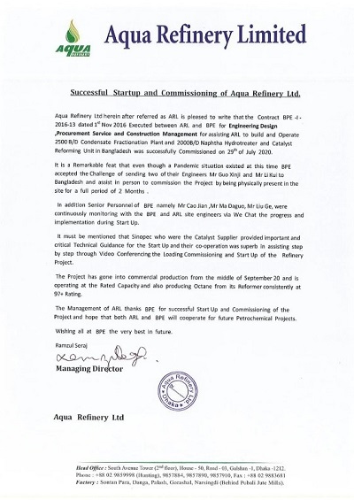 近日,由北京石油化工工程有限公司負(fù)責(zé)設(shè)計(jì)及部分采購工作的孟加拉項(xiàng)目(2500B/D凝析油蒸餾裝置和1500B/D半再生重整裝置)業(yè)主AQUA Refinery公司發(fā)來感謝信,對(duì)我公司在項(xiàng)目設(shè)計(jì)、建設(shè)方面做出的努力給予了高度肯定和贊揚(yáng),并對(duì)在孟加拉國新冠疫情爆發(fā)時(shí)期,為配合項(xiàng)目試車工作我公司派出的兩位專家表示感謝。