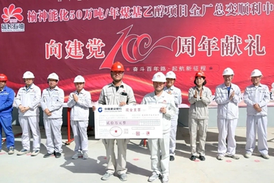 6月30日,由公司EPC總承包的榆神能化50萬噸/年煤基乙醇項目全廠總變中交暨向建黨100周年獻禮慶;顒釉诳傋儸F(xiàn)場舉行。