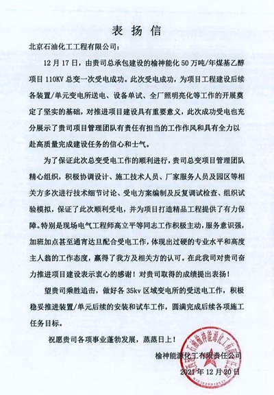 近日,延長石油榆神能化公司再次發(fā)來表揚信,對北京石油化工工程有限公司總承包的50萬噸/年煤基乙醇項目110KV總變一次受電成功表示祝賀。此次受電成功,為項目工程建設(shè)后續(xù)各裝置/單元變電所送電、設(shè)備單試、全廠照明亮化等工作的開展奠定了堅實的基礎(chǔ),對推進(jìn)項目建設(shè)具有重要意義。