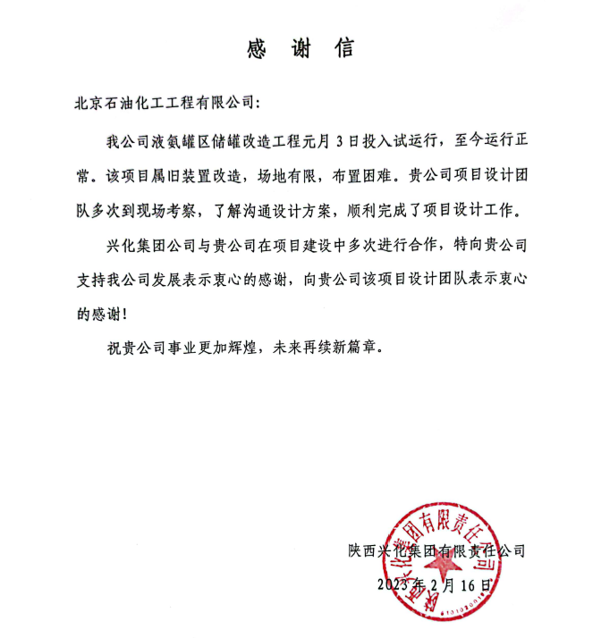 近日,北京石油化工工程有限公司收到陜西興化集團(tuán)發(fā)來的感謝信,對(duì)我公司在負(fù)責(zé)液氨罐區(qū)儲(chǔ)罐改造工程設(shè)計(jì)工作期間優(yōu)化設(shè)計(jì)方案、主動(dòng)協(xié)調(diào)配合,高質(zhì)量完成建設(shè)任務(wù)給予了充分肯定。